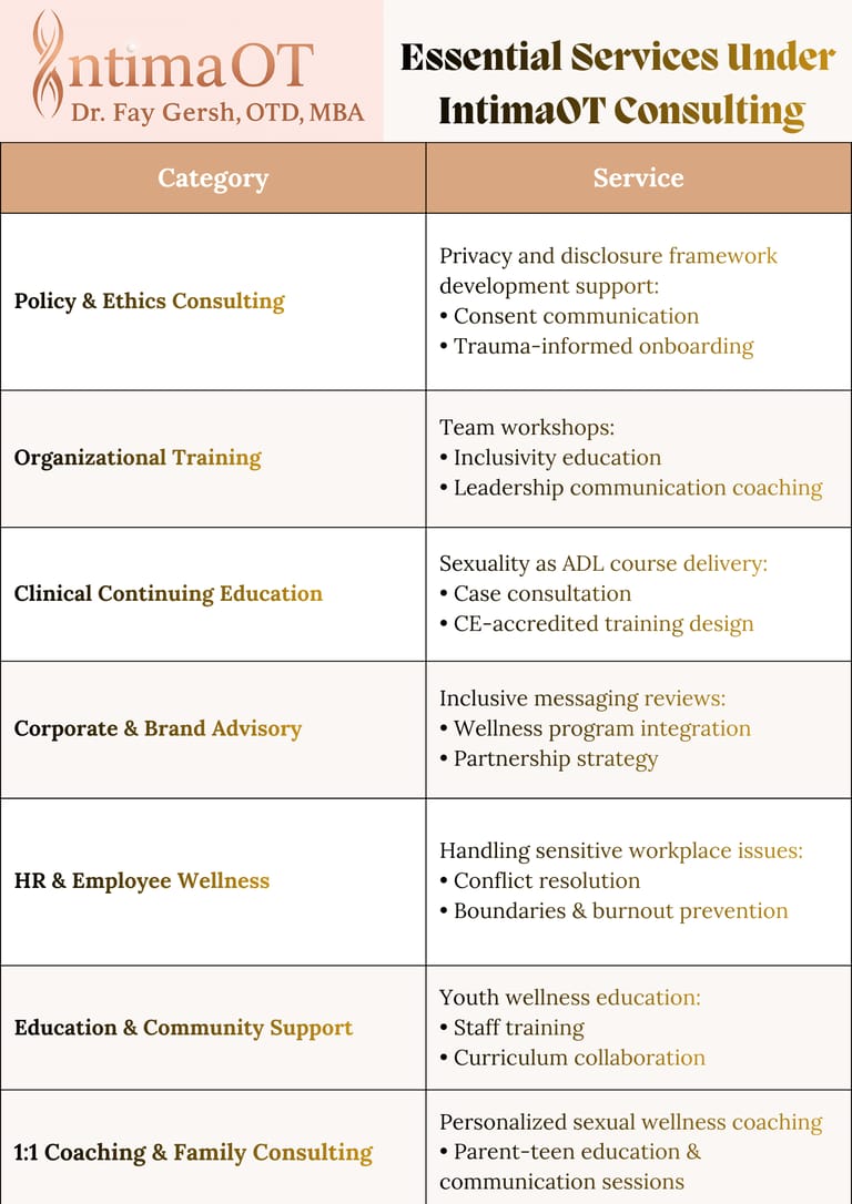 * Clinical & Healthcare Education: Training and continuing education on Sexuality as an Activity of Daily Living (ADL) for clinicians and multidisciplinary teams.